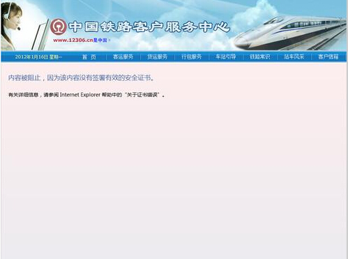 12306订票网站提示证书错误是因为您使用的是IE9浏览器,而12306订票网站和IE9有一些不兼容,IE9会提示12306订票网站证书错误,您需要手动导入网站证书才可以解决