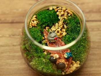 苔藓微景观,是用苔藓植物和蕨类植物等生长环境相近的植物,搭配各种造景小玩偶,运用美学的构图原则组合种植在一起的新型桌面盆栽。