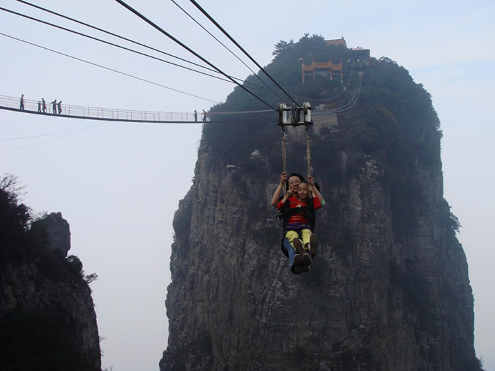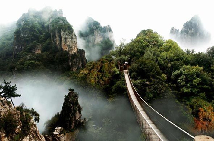五老峰,这里层层峰峦,森森古木,各种生物覆盖着整个山野。花红草绿,山光水色,风光旖旎非凡,故有“北有五台观庙宇,南在五老看风光”之说。游人往西南远眺,见有四座山峰仙态神姿,隐现于云烟苍茫之中,将海拔高1809.3米的玉柱峰环抱其中,“有偃蹇伛偻之状”,犹如五位老人抱拳作揖恭迎贵宾之势。主峰玉柱峰,石壁如削,形同玉柱,直插云霄,又名“云峰”、“灵峰”。游客需穿过80余米的惊险铁索天桥到达玉柱峰,顶上有3000多平方米的坦地,北高南低,有七大人文景点:南天门、灵官庙、玉皇殿、秀士殿、千子堂、祖师庙、后土娘娘庙等建筑遗址。