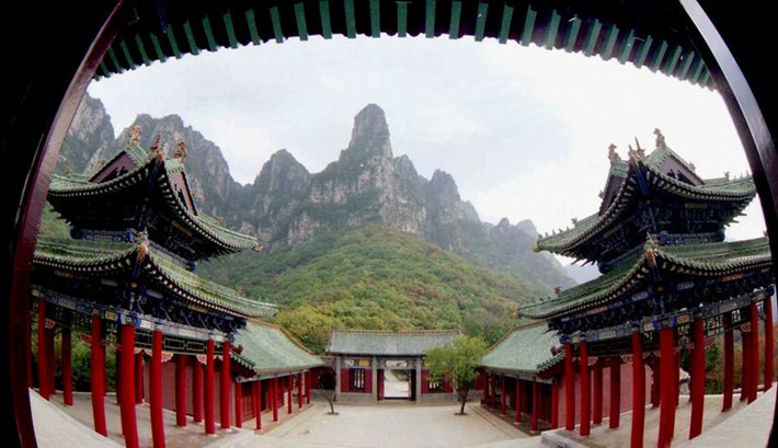 五老峰史称东华山,历史上为北方道教名山,海拔1809.3米,奇峰险峻,需攀链而上,属丹霞地貌。