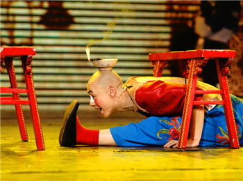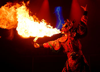 四川的川剧演员表演地道的“变脸”和“喷火”。据业内人士讲,变脸是一种“瞬间艺术”,演员根据剧情的需要,在极短的时间内,在抬手、拂袖、甩头之间,变换出不同的面目。不同的脸谱代表人物不同的神态和心态,用来表现惊恐、愤怒、开心等情绪和心理的变化。变脸表演需要经过十几年的刻苦磨炼,一般演员只能变6张脸,而这两位演员最少可以变9张脸,最多时可以变13张脸,使节目高潮不断。