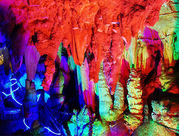 有的颜色鲜艳欲滴;有的碧绿透明;有的五色俱全,缤纷绚丽,宛若仙境。洞中还有溪水从钟乳石缝中流过,人称“阴河”。