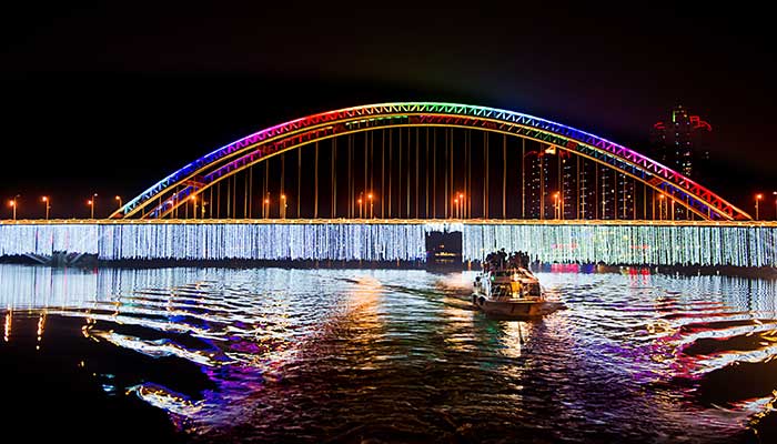 富乐山、南山寺、五一广场、铁牛广场、滨江广场、碧水寺、越王楼依次坐落于两岸,山水相映,风光无限。