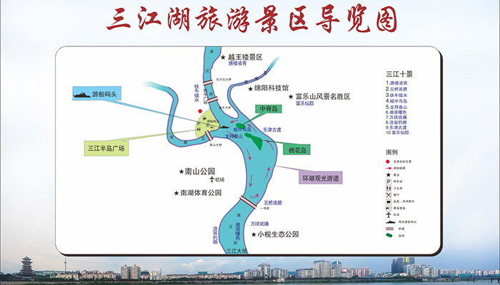 三江湖位于市区二环路内,汇聚涪江、安昌江、芙蓉溪之水而成,水域面积达5平方公里。