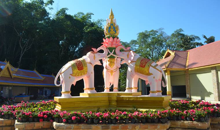 三象广场位于景区的中心位置,它是由三头大象用鼻子托起坐在莲花座上的释迦牟尼的雕塑。