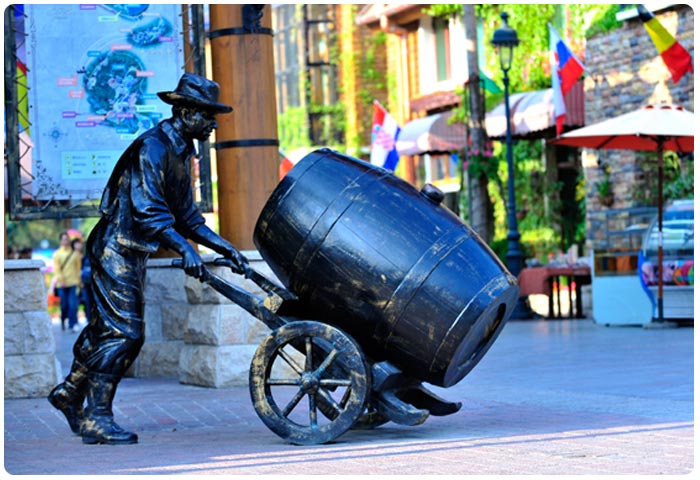 海菲德小镇以葡萄酒文化为主题的美洲风情小镇,原木与砖石相结合的建筑温馨质朴,系列铜雕展示了从葡萄采摘到红酒酿造的全过程,演绎了19世纪美国加州纳帕山谷的红酒小镇风情。主要包括天幕、海布伦宫、红酒体验馆、自酿啤酒屋、湖畔美食廊、小镇客栈等特色项目,为游客精心打造了一处与红酒约会的陶醉之乡。小镇上空覆盖着一条天幕,长120米,宽12米,投影达12米,天幕技术非常先进,不但可以分别播出普通影视节目,还可以播出特制的节目信号,为小镇增添浪漫的风情。